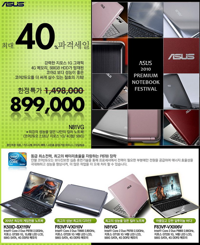 2010 최강의 게임전용 노트북으로 평가 받고 있는, 아수스 K50ID-SX119V의 경우 인텔 코어2듀오 P8700에 지포스 GT320 1GB 제품으로 어지간한 3D게임도 문제없다는 평가를 받고 있다. 성능은 물론 디자인에서도 좋은 평가를 받고 있는 아수스 F83VF-VX010V의 경우 인텔 코어2듀오 T9600에 그래픽카드는 지포스 GT220 1GB로 성능과 디자인의 두 마리 토끼를 잡은 제품이다. 이번 기획전에 참여하는 마지막 제품인 아수스 F83VF-VX006V의 경우 인텔 코어2듀오 P8800과 지포스 GT220 1GB의 그래픽카드가 멋진 조화를 이룬다.